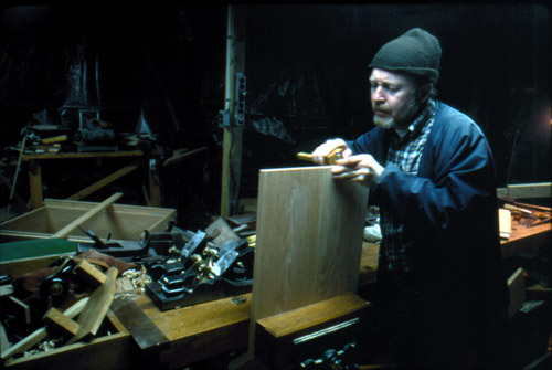 James Price uses a marking gauge on a chest lid panel in 1986. Photo courtesy of James Price.