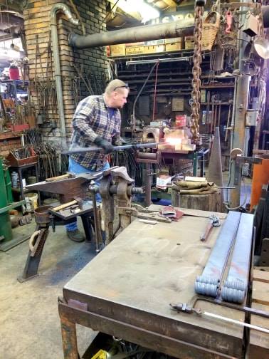 Coal, copper, and steel. These are the basic materials that master blacksmith Pat McCarty and his most recent apprentice Matt Dickson require when they meet for eight hour sessions at Washington Forge. With those materials, Matt practices joinery and hammer control, riveting and fastening, heating and veining. With those materials, techniques, and the right tools, Pat knows that Matt can learn to complete projects that are “finished to last a lifetime.”
