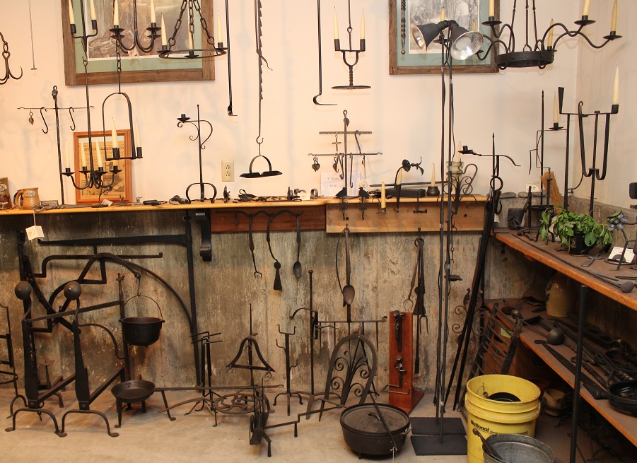 For this apprenticeship, then, Alexander and Dickson designed their lesson plan to create colonial style table lamps, chandeliers, and cooking utensils. The master blacksmith noted that colonial era reproduction pieces rely heavily on forge welding, and the team, then, would rely on traditional tools throughout their meetings, rather than use any electric or gas welding equipment. The table lamps, like those pictured above at the blacksmiths’ feet, for instance, can each require five forge welds. Based on a site visit by Folk Arts Specialist Deborah Bailey, and the smiles, it definitely appears that Matt Dickson is one step closer to his goal to be a master blacksmith someday.