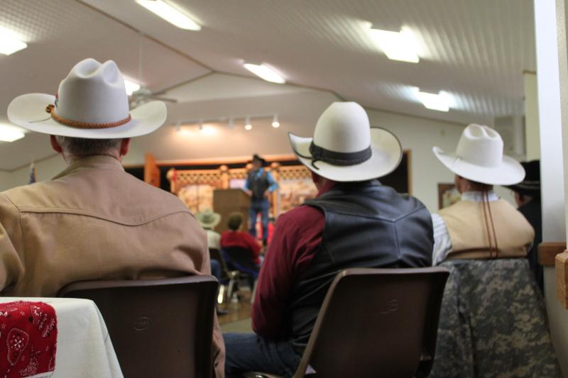 Cowboy poets Ken Lorton (farthest left), Richard Dunlap, D.J. Fry and Jake White watch on as other poets perform at the cowboy poetry festival on Saturday, April 27. Credit Harum Helmy / KBIA News
