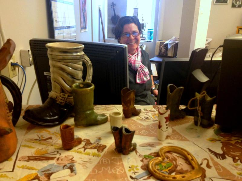 Lisa Higgins, director of the Missouri Folk Arts Program, poses in her office on April 22, 2013. Tiny cowboy boots decorate Higgins’ workplace. The folk arts program heled the annual Missouri Cowboy Poetry and Music Festival with Missouri Arts Council grants. Credit Harum Helmy / KBIA News